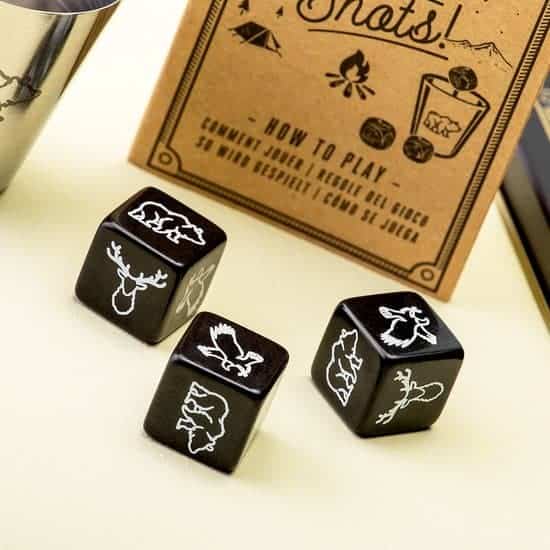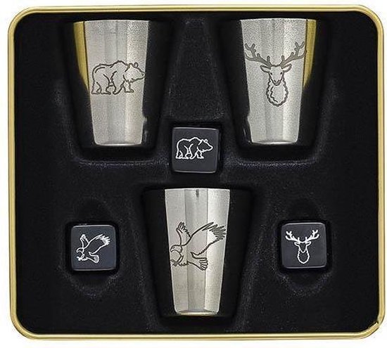 • Inhoud: spelinstructies, 3 dobbelstenen, 3 RVS shotbekers,