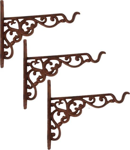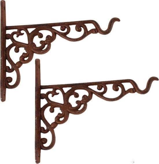 Antiek roestbruine kleine gietijzeren klassieke (Victoriaanse) hanging basket haak. Draagkracht tot 32 kg. Bijpassende hanging basket heeft artikelnummer: BPH25.