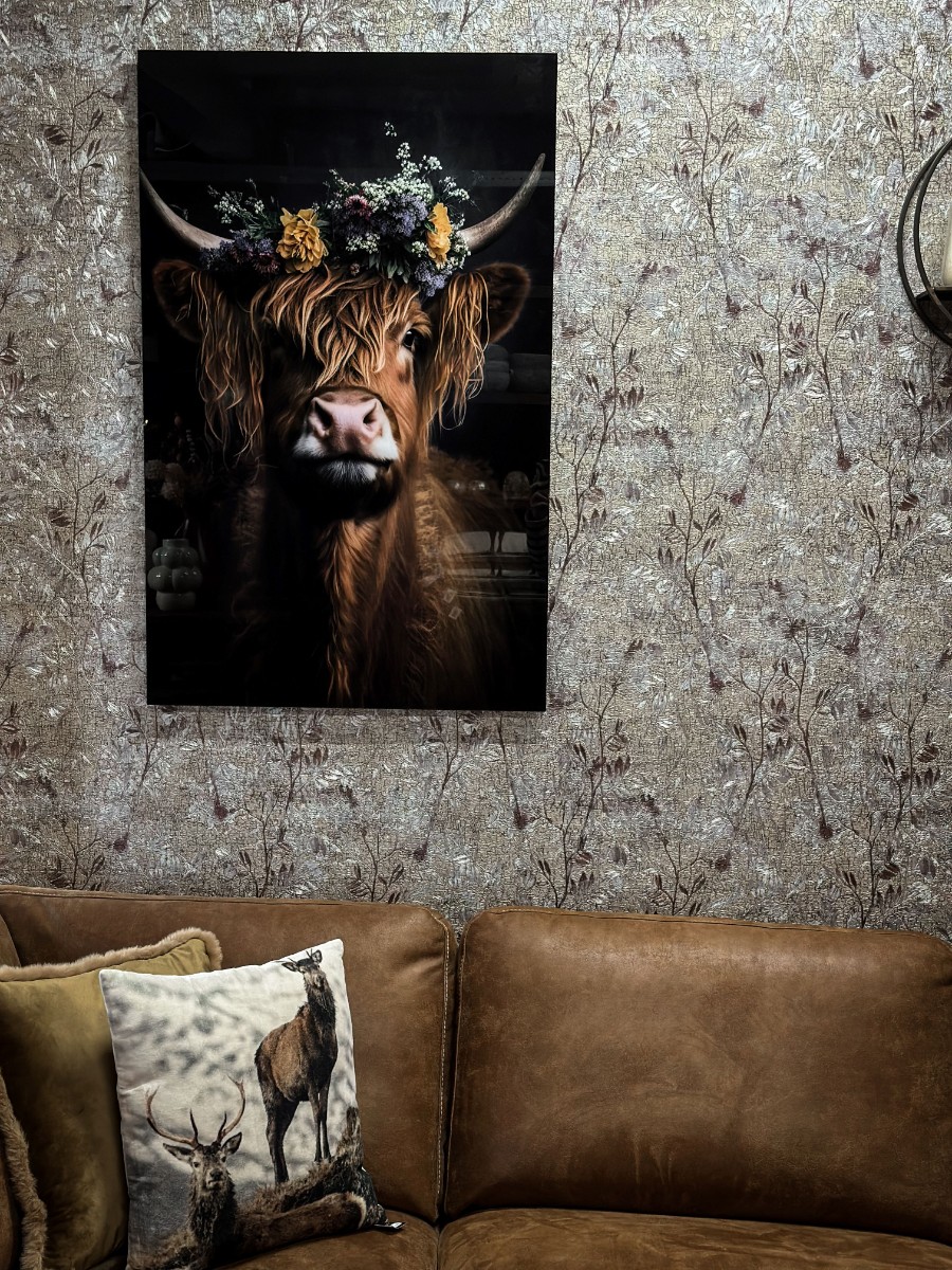 Schilderij tempered glass schotse hooglander bloemenkrans