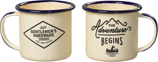 Deze cr?me kleurige emaille mokken komen met een leuk vintage logo met de tekst ?The Adventure Begins?, en aan de andere zijde van de mok het logo van Gentlemen?s Hardware. Deze emaille mokken zijn licht van gewicht en vrijwel onverwoestbaar. Uiteraard zijn deze stoere espresso mokken ook leuk voor thuis in de keuken, zodat je kunt genieten van een shot Italiaanse espresso in de vroege ochtend. De set van 2 espresso mokken zijn zowel leuk om te geven als te krijgen doordat hij komt in een leuke retro verpakking.