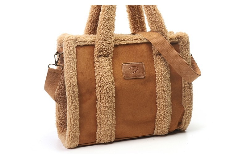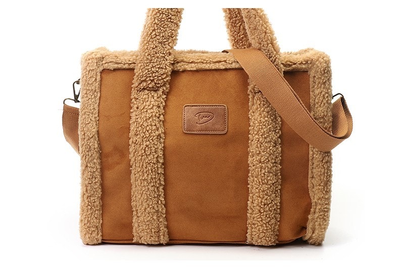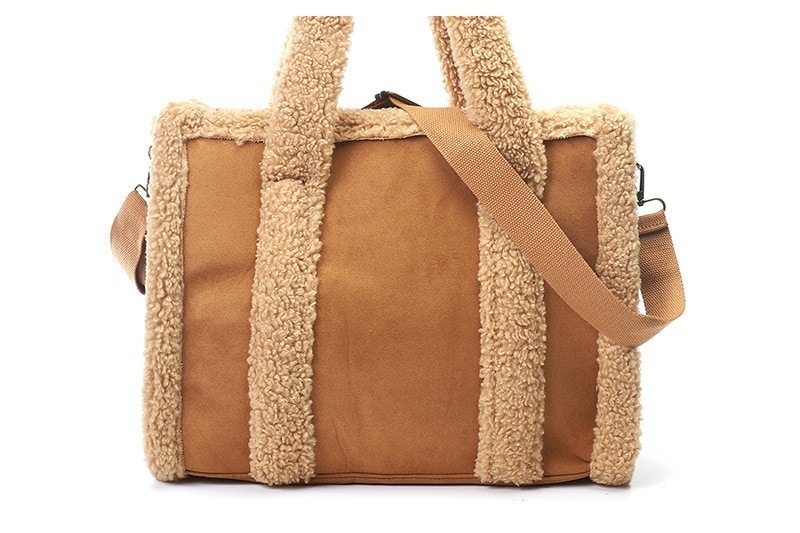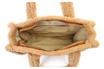 De shopper heeft een prachtige suede look en is omlijst met een luxueuze teddystof in een elegante effen kleur en wordt geleverd met een schouderband.