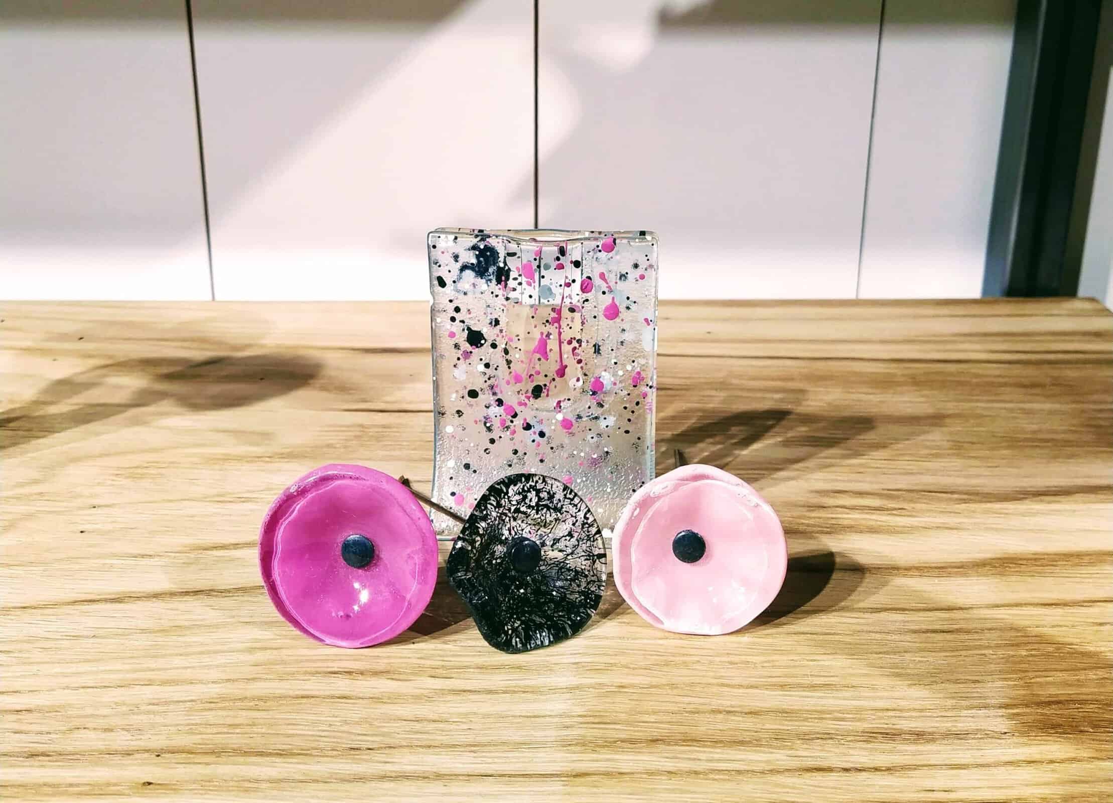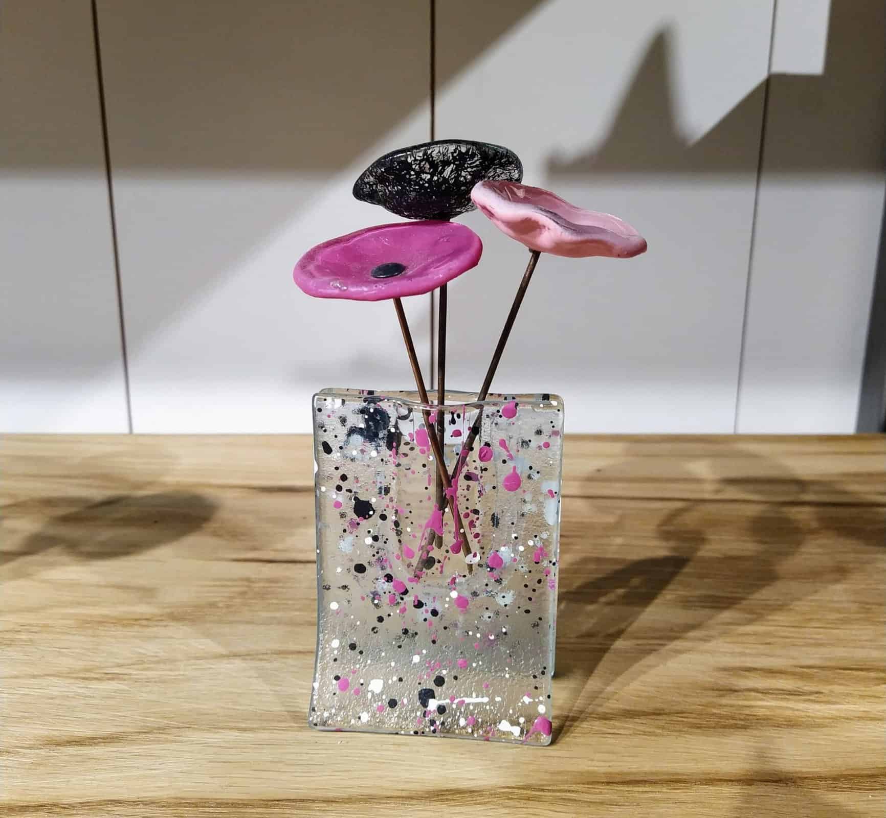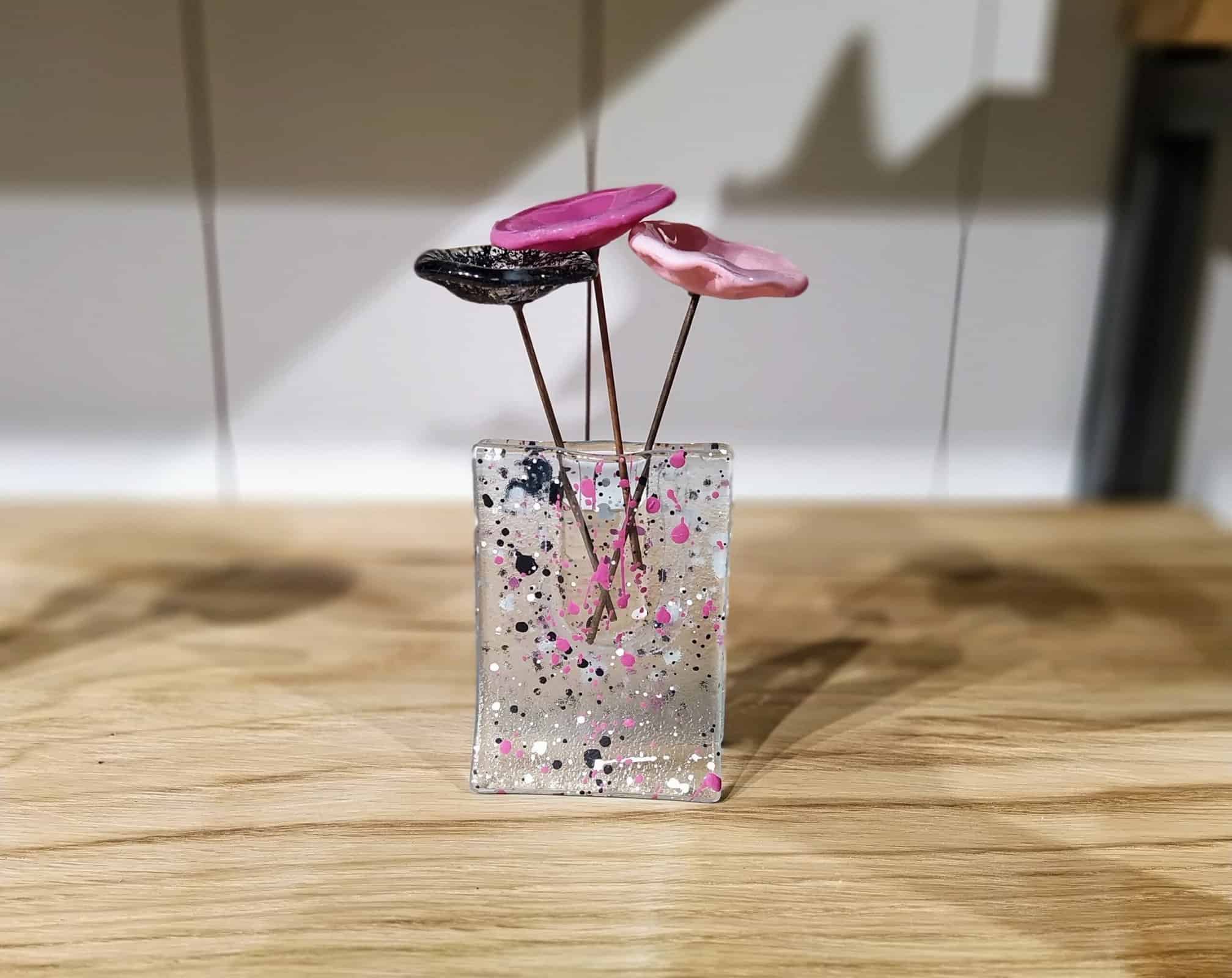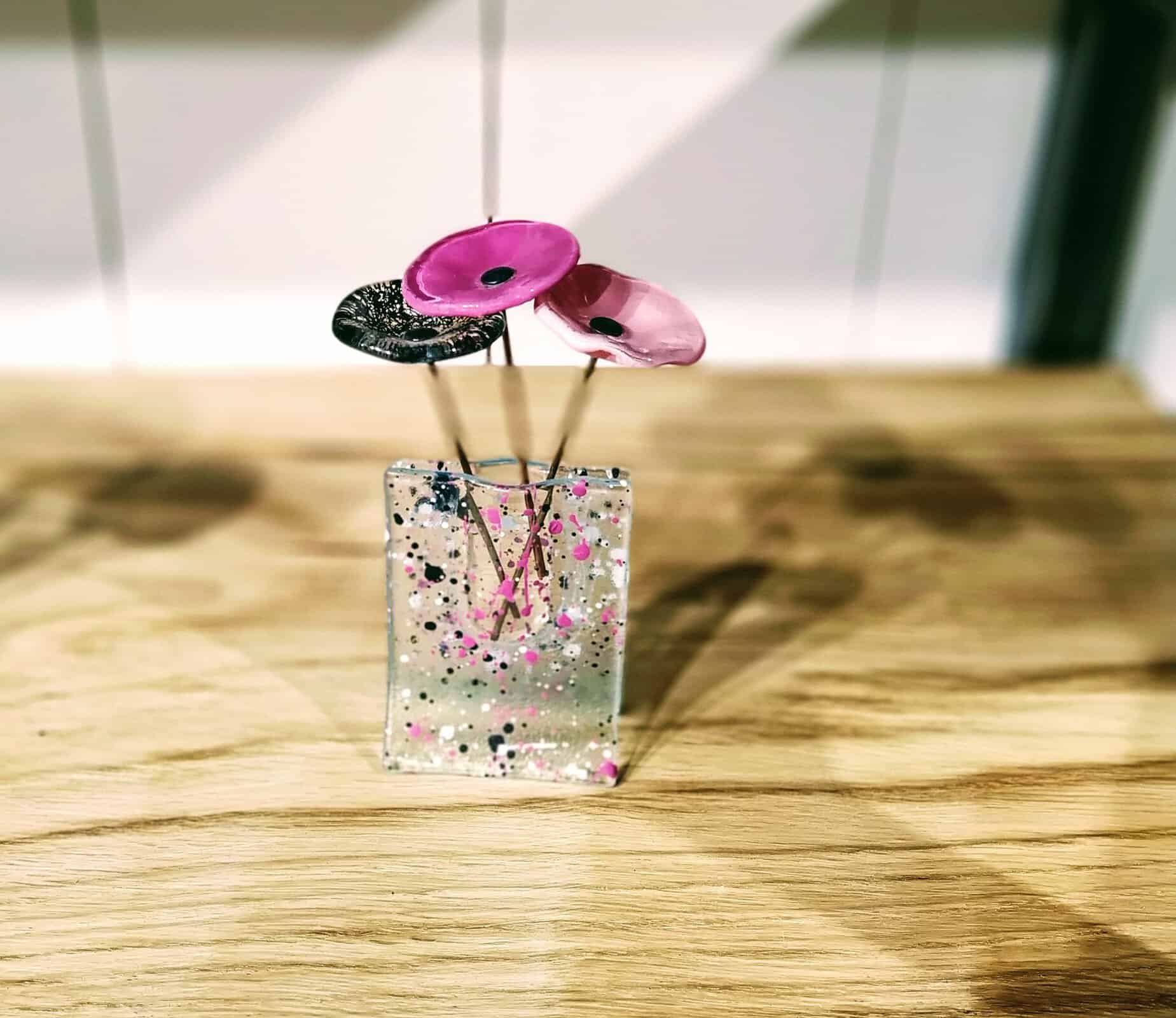Deze leuke mini vaasjes met glazen bloemen zijn er in verschillende kleuren.